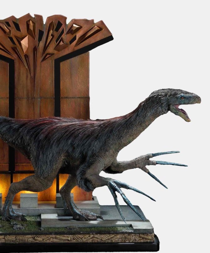 Our exceptional team of artists has come together and done an outstanding job of capturing the enormity of this creature. Standing at almost 19 inches and 30 inches wide, the Giganotosaurus stands ready to take on both the T-Rex and Therizinosaurus simultaneously and show them what the most powerful predator is made of. With a long and narrow skull, lined with extremely sharp, serrated teeth, its powerful jaw is open, about to snap on its prey, crushing the bones and flesh altogether. Muscular legs, stepping on the ruins of a partially destroyed Sanctuary, ready to lunge at high speed. Texturing, shading and coloring, big scales, a long-striped tail, and every little detail take this piece to the next level. This massive carnivore theropod is ready to wreak havoc and lay its enemy to waste. The base features a layer of fossils beneath the earth and the crumbles of the Biosyn Sanctuary.