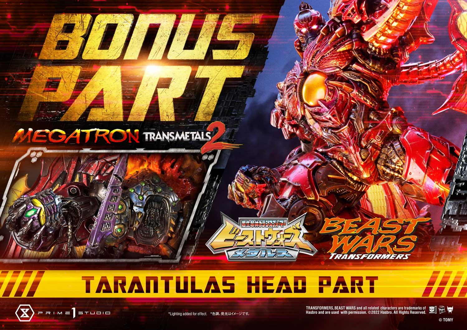 Megatron comes with three (3) swappable head parts...each depicting a different emotion from the Predacon leader. Furthermore, when you pre-order this Deluxe Bonus Version from our official online store or any authorized distributor will you receive a cool, extra Bonus Part: a swappable right hand holding the decapitated head of Tarantulas! This will also include a swappable headless Tarantulas part, to complete the brutal scene. Choose well when you display him in your Beast Wars display case!