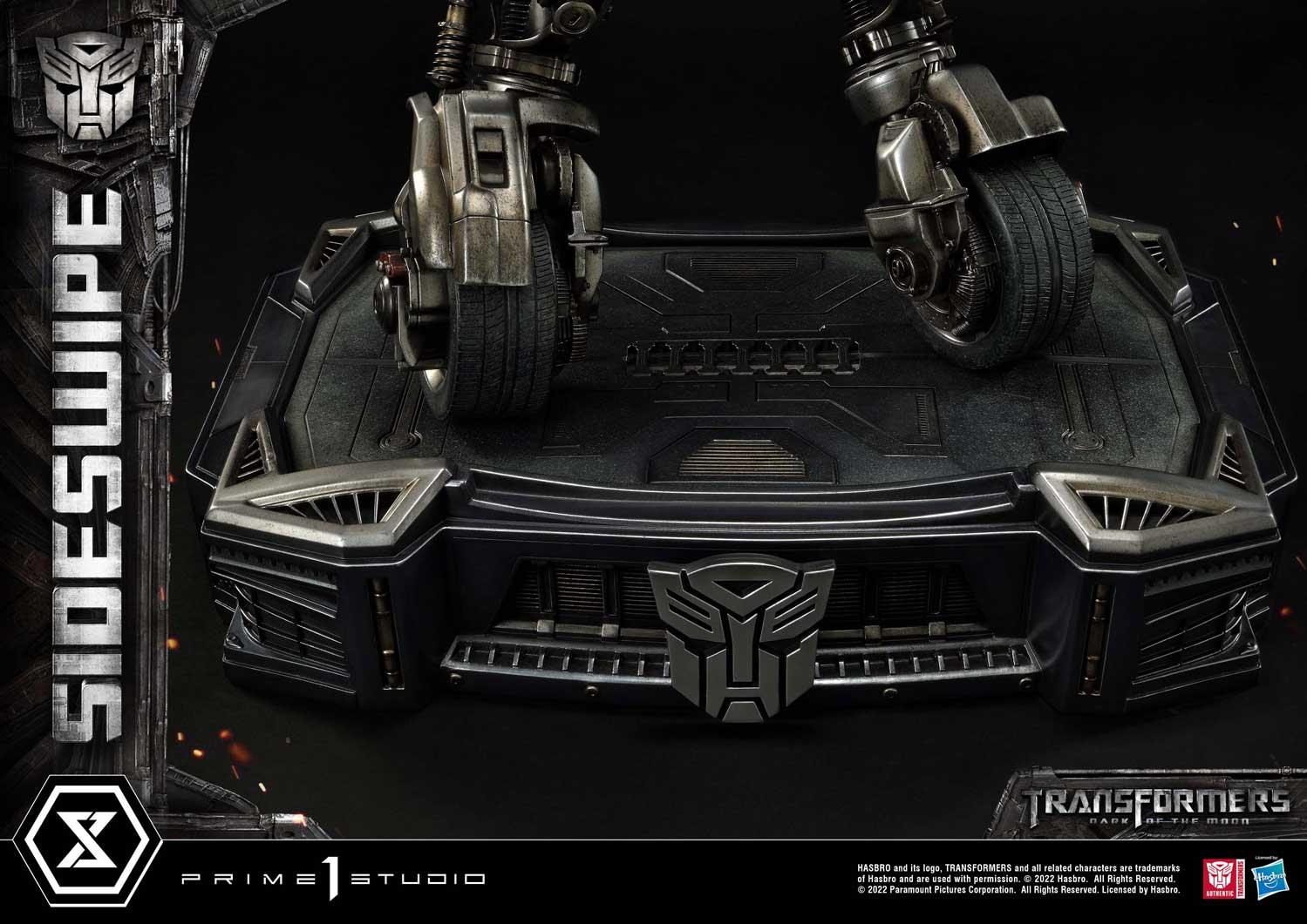 Balancing on his twin-wheeled form, Sideswipe is prepared for a standoff on a smartly-appointed Autobots base featuring the Autobots logo front and center!